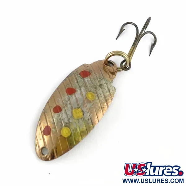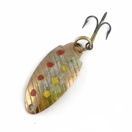 Ett diagonalt räfflat mönster utmärker framsidan av detta kopparfärgade skeddrag, vilket ger en strukturerad yta för dess handmålade röda och gula prickar. Detta Tommen Dolly mäter 4 cm (1 1/2") och väger 5 g (3/16 oz), och är tillverkat i USA med produktkod 23684. Betet är utrustat med en trekrok monterad via en fjäderring, medan ett monteringshål finns i den avsmalnande nosen. I ett skick på 4/5 uppvisar metall- och lackytan ett mjukt, åldrat utseende som bekräftar dess vintagestatus. En enkel fjäderring fäster krokarna vid den stansade metallkroppen.
