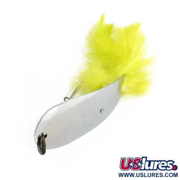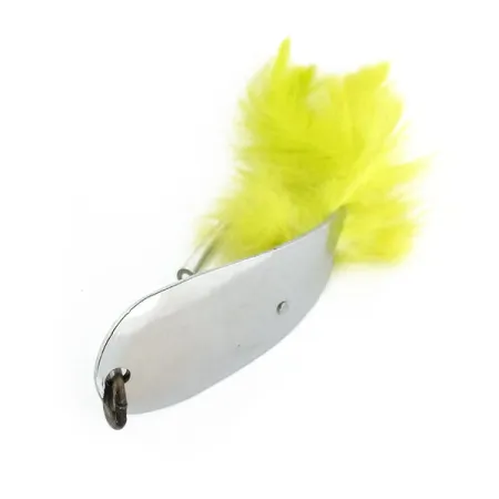 Förnickling ger en spegelliknande finish på detta amerikansktillverkade skeddrag, en viktig design för att reflektera ljus under olika vattenförhållanden. Med en vikt på 12 g (2/5 oz) och en längd på 5,5 cm (2 1/4") representerar denna Tony Accetta HOBO, identifierad med produktkod 13200, en klassiker i fiskelådor från mitten av århundradet. Den konkava sidan av dragets kropp är stämplad med tillverkarens märke och "Genoa, O.", vilket speglar dess ursprung i USA. En enkelkrok är integrerad i designen, prydd med livfulla gula hackelfjädrar som skapar en tydlig kontrast mot den polerade metallen. För att underlätta fiske i vegetation vid utkast, är ett tunt vasskydd av tråd placerat över krokspetsen. Exemplaret är i 5/5 skick och bibehåller en ljus lyster på sina förnicklade ytor och originalkomponenter.