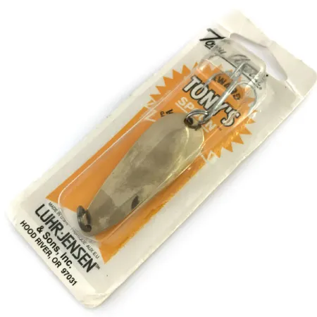 Detta skeddrag i kraftig metall är pläterat i äkta 24K guld och ligger kvar i sin originalförpackning från Luhr-Jensen & Sons från Hood River, Oregon-eran. Exemplaret är oanvänt och har ett skickbetyg på 6, vilket återspeglar dess välbevarade tillstånd i den genomskinliga blisterförpackningen. Detta drag på 11 g (2/5 oz) har produktkod 4933-005-0599 (9488), mäter 5,5 cm (2 1/4") och har en tillverkningsstämpel med datumet 99-06-22 på baksidans etikett. Tony Accetta-skedar är kända för sin enkla stansade design, där 24K guld-finishen maximerar ljusreflektionen vid kast- eller trollingfiske. Hårdvaran består av en robust trekrok baktill och ett förborrat noshål för säker lininfästning. Just detta exemplar har det ursprungliga flerspråkiga katalogerbjudandet kvar på baksidan, en detalj som var vanlig i Luhr-Jensens internationella distribution under slutet av 1990-talet.