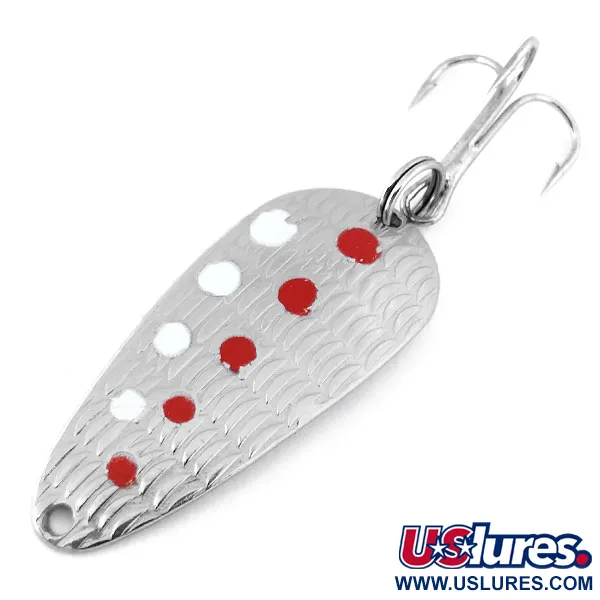 En försilvring med ett strukturerat fjällmönster kännetecknar den konvexa ytan på detta 4 cm (1 1/2") långa drag. Med en vikt på 7 g (1/4 oz) är detta exemplar en utgången modell ur Acmes historia, identifierad med produktkod 10811. Framsidan har ett specifikt mönster med fem röda punkter och fyra vita punkter, där de senare är utformade för att reagera under ultraviolett ljus. På baksidan är namnet "TORNADO SPOON" stämplat direkt i metallen, vilket visar på dess ursprung i USA. Detta drag är oanvänt och i utmärkt skick, även om det inte längre åtföljs av sin originalförpackning. En fjäderring i stål håller trekroken på plats, avsedd för spinnfiske eller trolling.