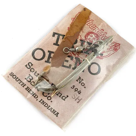 Med en längd på 4,5 cm (1 3/4 tum) representerar detta specifika exemplar flugspövarianten nr 594 av den klassiska South Bend Trix-Oreno. Den silverfärgade metallkroppen ligger förvarad i sitt originalkuvert av pergamyn med röd grafik från South Bend, Indiana, och är helt oanvänd, vilket ger en inblick i sportfiskeinnovationer från 1940-talet. Detta drag på 2 g (1/16 oz), katalogiserat under produktkod 17393, har en monterad gummistrimla utformad för att locka fisk från djupa, mörka höljor under kvava sommardagar. South Bends konstruktion gör att betet fladdrar likt en levande insekt när det sjunker, medan en enkel spörörelse får det att dyka och vicka som en simmande småfisk. Utrustningen inkluderar ett smidigt lekande och krokstorlek 1, speciellt utvalt för att minska belastningen på flugspöt jämfört med vanliga spinnare. På baksidan av förpackningen beskriver South Bend de tre olika utföranden som fanns tillgängliga för flugspöstorleken, och noterar att 594-modellen avsiktligt levererades med gummistrimla istället för en metallsked.