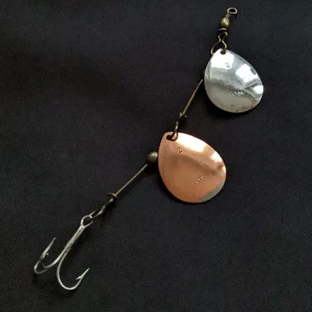 Skedar i nickel och koppar ger den främsta visuella kontrasten på detta exemplar som väger 7g. Vintage Luxon 2 dubbelspinnare har två olika ytfinishar i metall stämplade med siffran 2, och använder droppformade skedar monterade i tandem på en styv mässingsfärgad trådstomme. Med en längd på 10 cm visar denna amerikansktillverkade raritet upp den funktionella design som LUXON var känt för, med fokus på hållbarhet i dess trådkonstruktion. Konstruktionen kompletteras av mässingspärlor och precisionsböjda öglor som säkrar komponenterna utan att lägga till onödig vikt. Betet, med produktkod 22217, är i utmärkt skick och metallytorna har kvar sin ursprungliga lyster, vilket motsvarar ett skick på 5/5. Trekroken är fäst via en standardögla, vilket säkerställer att de ursprungliga silverfärgade komponenterna förblir en central del av bygget.
