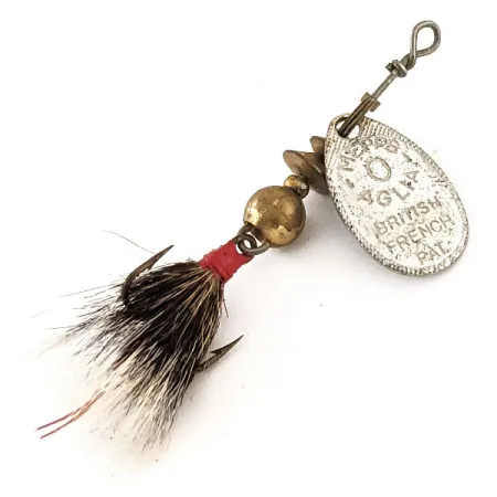 Stämplad med "BRITISH FRENCH PAT" och "MADE IN FRANCE", reflekterar det silverpläterade skeden på detta exemplar från 1970-talet dess arv som en klassisk Andre Meulnart-design. Med en vikt på 2,5 g (3/32 oz) har denna spinnare i storlek 0 den ikoniska Mepps Aglia utformningen. Dressingen på trekroken är äkta ekorrsvans, noggrant bunden med en klar röd tråd som har behållit sin färg märkvärdigt väl under decennierna. Betet, som mäter 4,5 cm (1 3/4") i total längd, visar upp de mässingspärlor och den bygel som definierade Mepps standard för hållbarhet. Detta specifika föremål, identifierat med produktkod 13124, monterades i USA med franskproducerade komponenter, vilket var vanligt under varumärkets expansion under Todd Sheldon. Trekroken är fortfarande vass och silverpläteringen på skeden behåller en ljus, reflekterande finish. Skicket är utmärkta 5/5, vilket visar den omsorg som tagits vid bevarandet av detta delikata lättviktsbete. Den breda skeden är konstruerad för att rotera så snart den kommer i kontakt med vattnet, ett tekniskt kännetecken för konrotationssystemet. Ekorrhårets naturliga textur ger en subtil profilkontrast mot de metalliska komponenterna.