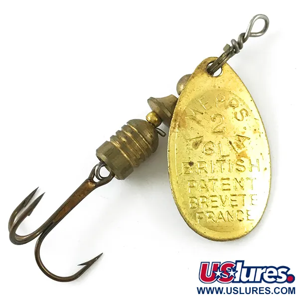 Stämplad med den distinkta märkningen ”British Patent Brevete France” visar detta Aglia-skedblad i storlek 2 sitt arv från mitten av århundradet. Med en vikt på 4,5 g (3/16 oz) representerar detta exemplar den tidiga eran när Mepps-komponenter tillverkades i Frankrike och monterades i USA. Kroppen på 5,5 cm (2 1/4") har en serie solida mässingspärlor och en räfflad vikt som balanserar det guldpläterade skedbladet. På baksidan bekräftar en tydlig ”Made in France”-stämpel de mekaniska delarnas ursprung. Denna spinnare, med produktkod 4671, håller hög samlarkvalitet och är rankad 5/5. Originaltrekroken är fortfarande vass och strukturellt intakt, typiskt för Andre Meulnarts design som revolutionerade marknaden för spinnare. Guldfinishen på det droppformade bladet är jämn över hela ytan. Denna specifika konfiguration, med sin koniska rotationsenhet, utgjorde grunden för vad många anser vara världens mest framgångsrika spinnardesign.