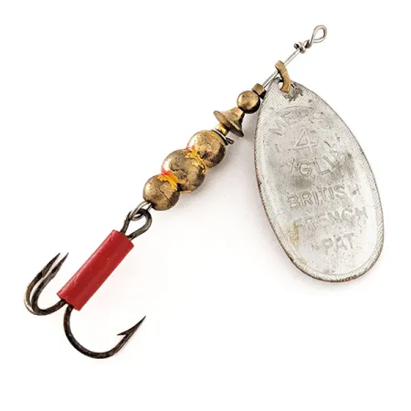 Direkt stämplat på det silverpläterade skedbladet finns kännetecknen för en klassiker: "AGLIA 4 BRITISH FRENCH PAT", vilket identifierar denna spinnare som ett genuint exemplar från 1970-talet. Detta specifika exemplar, katalogiserat under produktkod 11963, väger 9 g (1/3 oz) och mäter totalt 7 cm (2 3/4"). Kroppen består av tre staplade mässingspärlor som fortfarande bär spår av sin ursprungliga röd-orangea färg. Dessa pärlor sitter under den klassiska konformade bygeln, designad för att underlätta en mjuk rotation för det breda skedbladet. Betet är utrustat med en trekrok som inkluderar en röd plastslang av vintagemodell, en vanlig detalj för att locka abborre och gädda under varierande vattenförhållanden. Medan de viktigaste komponenterna tillverkades i Frankrike, monterades detta bete i USA under varumärkets storhetstid i Nordamerika. Silverpläteringen och mässingskomponenterna är rena och välskötta, vilket ger detta exemplar ett skickbetyg på 4/5.