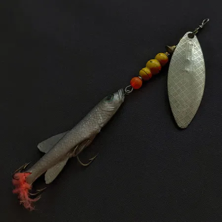 Med en total längd på 10 cm (4 tum) representerar denna hybridspinnare en unik era av Mepps hantverk där franska komponenter kombinerades med amerikansk montering. Det silverfärgade willow-bladet i storlek 3 har en präglad diamantmönstrad textur på framsidan och en tydlig "Made in France"-märkning på baksidan. Bakom bladhållaren sitter en rad med fem pärlor – en orange och fyra gula – som ger en visuell övergång till Mino-jiggen i mjukplast. Detta exemplar på 14 g (1/2 oz), med produktkod 21023, är utrustat med en trekrok som sticker ut från den realistiska silverfärgade fiskkroppen, prydd med en diskret tofs av röda fibrer vid stjärten. Betet är i skick 4/5, där mjukplasten fortfarande är anmärkningsvärt smidig och metalldelarna har kvar sin blanka finish. Konstruerad främst för spinnfiske eller trolling, gör vikten att man når önskat djup samtidigt som det texturerade bladet ger en jämn visuell profil.
