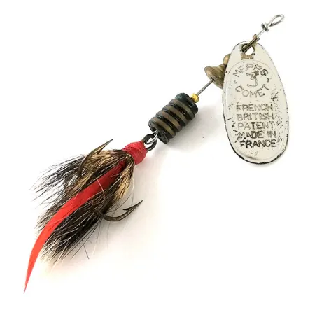 Tydligt stämplat på silverskeden definierar 'Made in France' och patentmärken karaktären hos denna 6,5g (1/4oz) klassiker. Detta exemplar från 1960-talet har den ikoniska Comet-skedformen, utmärkande för sin rundade profil och intrikata gravyrer inklusive storleksbeteckningen 3. En anmärkningsvärd konstruktionsdetalj är det utbytbara kroksystemet, som gör det möjligt för sportfiskaren att lossa den klädda trekroken från huvudramen. Med en längd på 7cm (2 3/4") är betet byggt med en serie staplade, mörkräfflade kroppspärlor som ger den nödvändiga ballasten för kast. Trekroken är klädd med en kombination av naturligt ekorrsvanshår och en enda livlig röd fjäder, allt säkrat med en tät röd trådlindning vid öglan. Med tecken på sin historia och ett skickbetyg på 4/5 förblir silverfinishen och hårdvaran ren och funktionell. Även om komponenterna har sitt ursprung i Frankrike monterades denna modell i USA, vilket representerar en betydande period i Mepps distributionshistoria. Vikten är fördelad över axeln för att stödja balansen hos den roterande skeden under en jämn invevning.