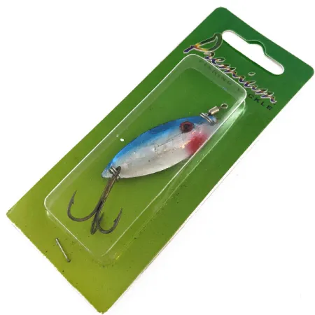 Blå och silverfärgade ytor ger detta 4,5 cm droppformade skeddrag en klassisk profil av en betesfisk. Med en vikt på 7 g är Wahoo Key Largo Swim'n Fin utrustat med en invändig rasselkammare för att ge en ljudlig lockelse vid sidan av sitt visuella blänk under vertikalfiske eller spinnfiske. Denna modell bär tillverkarens kod 17395 och ligger kvar i sin gröna originalförpackning från märket "Premium". Färgmönstret går från en livfull blå rygg till en skimrande silverbuk, accentuerad av en tydlig röd huggpunkt nära det främre ögat. Utrustat med en vass bronserad trekrok och ett robust lekande i nosen, speglar betet sitt ursprung från Dominikanska republiken där det monterades med amerikanska komponenter. Detta exemplar är oanvänt och välbevarat, och uppvisar originalglansen över sin hållbara finish.