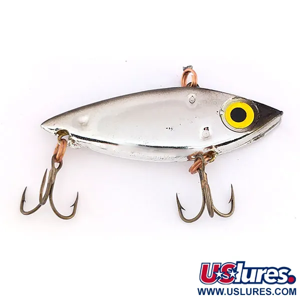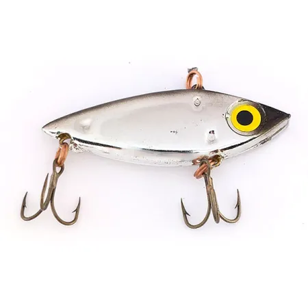 Med en längd på 6 cm (2 1/4") erbjuder detta kromade sjunkande rasselbete en betydande närvaro trots sin kompakta vikt på 10 g (1/3 oz). Tillverkad i USA av Wahoo (produktkod 9577), använder WAZP Rattler en lipless-konstruktion med ljudegenskaper designad för mångsidighet vid både spinnfiske och trolling. Ett gult öga med hög kontrast och djup svart pupill är satt mot en mörk rygg som smalnar av mot polerade silversidor. Komponenterna inkluderar två bronsfärgade trekrokar fästa med fjäderringar, och den toppmonterade linöglan underlättar fiske på varierande djup efter arter som gös, gädda eller abborre. I ett skick klassat som 5/5 är exemplaret exceptionellt välbevarat med en strålande lyster.