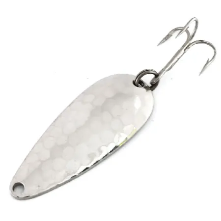 Med sin klassiska hamrade yta är den här vintageskedens finish i hamrad nickel utformad för att sprida ljuset i flera riktningar under ytan. Med en längd på 4,5 cm (1 3/4") och en vikt på 7 g (1/4 oz) återspeglar detta exemplar (produktkod 9717) den enkla funktionalitet som är typisk för amerikanska fiskeredskap från mitten av seklet. Om man vänder på draget syns varumärket WEBER djupt stämplat på den släta, polerade baksidan, ett kännetecken för tillverkningen i Stevens Point, Wisconsin. Den droppformade kroppen har ett fästhål i toppen och en kraftig fjäderring som håller originaltrekroken vid stjärten. Skicket är 5/5 och pläteringen är ljus och reflekterande utan tecken på betydande slitage eller oxidering. Drags konstruktion är optimerad för traditionellt spinnfiske där ljusreflexer är den främsta lockfaktorn.
