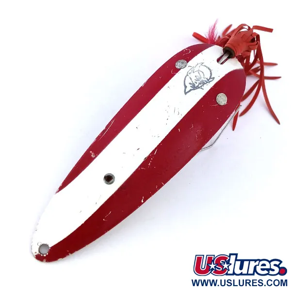 Röda och vita ränder pryder framsidan på detta skeddrag på 28g (1oz), som mäter exakt 9cm (3 1/2"). Weedless Dardevle tillverkas av Eppinger och identifieras med produktkod 10692. Den har den klassiska Devil Dog-logotypen stämplad i den vita färgen. Baksidan är i polerad nickel, vilket ger hög kontrast och synlighet under olika ljusförhållanden. Ett vasskydd med dubbla trådar är nitat vid kroppen, speciellt utformat för att hjälpa enkelkroken att navigera genom tät vegetation och ris. Stjärten är prydd med en röd kjol av hackelfjädrar och gummiben för att öka den visuella profilen. Skicket är klassat som 5/5, med synliga märken och små färgsläpp längs kanterna som är naturliga för dess ålder. Dessa beten började handtillverkas i Lou Eppingers källare i Detroit 1906 och blev så ansedda för sin effektivitet att de inkluderades i flygvapnets överlevnadskit under kriget. Den tunga metallkroppen är balanserad för långa kast i tät vegetation.