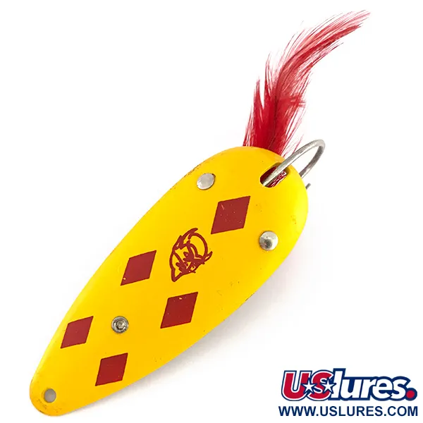 Det distinkta röda diamantmönstret på en livlig gul finish identifierar omedelbart detta "Five of Diamonds"-mönster som en klassisk Eppinger-palett. Med en längd på 7 cm (2 3/4") och en vikt på 21 g (3/4 oz) är detta Dardevlet-modellen, ett mångsidigt mellanstort val för olika vattenförhållanden. Denna specifika version har en vasskyddad konfiguration, inklusive en enkelkrok skyddad av ett dubbelt trådskydd och prydd med klarröda fjädrar. Komponenterna sitter tight och de röda fjädrarna är fylliga och välbevarade. Den ikoniska djävulshuvudslogotypen, tydligt stämplad på baksidan i mässingston, bekräftar arvet från företaget som Lou Eppinger flyttade till Dearborn, Michigan, 1959. Detta bete med 5/5-betyg är i utmärkt skick, med en ren, glansig finish på framsidan och en ljus, ooxiderad baksida. Produktkod 7907 identifierar detta tunga skeddrag för spinnfiske, utformat för att navigera genom växtlighet där standardkrokar annars skulle fastna.