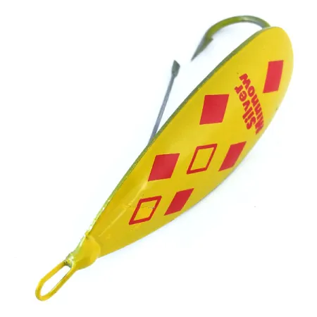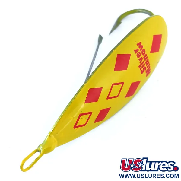 En lysande gul finish prydd med fem röda diamanter kännetecknar detta exemplar av Weedless Johnson Silver Minnow, katalogiserad under produktkod 11066. Detta skeddrag mäter 7 cm (2 3/4") och väger 17 g (3/5 oz) och är tillverkat av en speciell koppar- och zinklegering, konstruerad för att vara tjockare i mitten för att bibehålla krokens korrekta vinkel. Baksidan av draget är tydligt stämplad med ”JOHNSON'S SILVER MINNOW” och ”MADE IN U.S.A.”, vilket markerar det som ett vintage amerikanskt original. Den vasskyddade designen bygger på ett robust metallskydd som skyddar den fasta enkelkroken, vilket möjliggör effektivt fiske i tät växtlighet. I nuvarande skick, betyg 5/5, är de målade ytorna och metallbaksidan ljusa och välbevarade. Den tekniska designen låter draget vagga i en 270-graders vinkel, vilket genererar tydliga reflexer, medan den centrumviktade kroppen säkerställer en stabil gång utan behov av extra lekan.