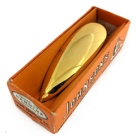 Detta skeddrag på 21 g (3/4 oz) glänser under en 24-karats guldplätering och representerar en höjdpunkt för de vasskyddade konstruktioner som Louis Johnson först lanserade 1920. Med en längd på 7 cm (2 3/4") bär detta specifika bete produktkod 11648 och levereras i sin orange originalkartong. För en samlare är det en sällsynthet att hitta detta vintage-exemplar tillverkat i USA i oanvänt skick, då guldfinishen har kvar den spegelblanka kvalitet som är tänkt att locka fisk på långt håll. Dragets utformning har en tjockare mittsektion, ett tekniskt val för att behålla krokens rätta position vid fiske i tät vegetation. På vintageförpackningen finns originalinstruktioner om hur man apterar den skyddade kroken med jiggar eller trailers för att efterlikna ett skadat byte. Denna modell uppvisar den klassiska droppformen och det vasskydd som blev standard i fiskelådor över hela kontinenten. Askens utsida ger en inblick i fisketips från mitten av seklet och betonar dragets effektivitet i gluggar och hål i vassen.