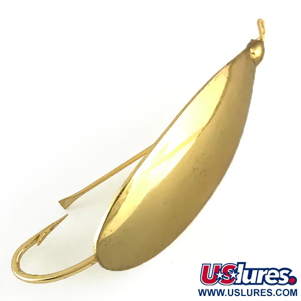 Glänsande med en klassisk guldytbehandling representerar detta exemplar den legendariska vasskyddade designen som Louis Johnson fulländade redan 1920. Skeddraget väger 6 g (3/16 oz) och är tillverkat i en specifik koppar/zink-legering som är tjockare på mitten, vilket hjälper till att bibehålla rätt gång vid hemvinnaren. Denna Weedless Johnson Silver Minnow, identifierad med produktkod 6698, mäter 4,5 cm (1 3/4") och har den ikoniska integrerade kroken med vasskydd för fiske i tät vegetation. Med betyget 5/5 uppvisar betet den högkvalitativa plätering som är typisk för vintage-lager tillverkat i USA innan produktionen flyttade utomlands. Guldytan är utformad för att ge blixtar nedåt och åt sidorna när kroppen vaggar i en 270-graders vinkel. Eftersom den vaggande rörelsen förblir konsekvent även med en trailer, väljer många samlare och sportfiskare fortfarande att para ihop dessa med pork rind för att efterlikna en skadad betesfisk. Enkelkroken är placerad för att förbli vänd uppåt, vilket avleder grenar och sjögräs samtidigt som den är exponerad för hugg underifrån.