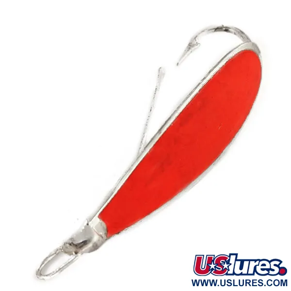 En iögonfallande neonorange finish täcker framsidan på detta 6 cm (2 1/4") skeddrag, vilket ger en högvisuell kontrast mot den försilvrad kroppen. Denna Weedless Johnson Silver Minnow UV, med produktkod 12487, väger 12 g (2/5 oz) och representerar en modern färgutveckling av Louis Johnsons originaldesign från 1920. Till skillnad från vanliga kromade ytbehandlingar använder detta exemplar äkta försilvring för att ge ett ljusare och vitare blänk. Det orangea toppskiktet är specifikt utformat för UV-reaktivitet; i svaga ljusförhållanden avger det ett djupt, lysande sken, vilket visas på bilderna tagna i mörker. Konstruktionen består av en koppar-zinklegering som är betydligt tjockare i mitten, en geometri som hjälper till att hålla enkelkroken upprätt. Denna balans, i kombination med det integrerade vasskyddet av tråd, gör det möjligt att fiska genom täta näckrosor eller bröte. Som en vintage USA-tillverkad modell speglar byggkvaliteten de ursprungliga specifikationerna innan produktionen flyttade utomlands. Försilvringen och den UV-reaktiva färgen visar mycket lite slitage, och hårdvaran är strukturellt intakt, vilket ger detta drag ett skickbetyg på 4/5.