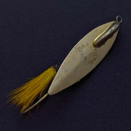 Med namnet "MARATHON" stämplat på framsidan, använder detta guldpläterade vassdrag en fast blykil pålödd på baksidan för vikt och stabilitet vid invevning. Det mäter 1 3/4" (4,5 cm) och väger 3/16 oz (6 g). Designen bygger på en enkelkrok skyddad av ett vasskydd av tråd för att kunna fiskas genom näckrosor och vattenvegetation. Ett lysande gult bucktail-hår är bundet nära krokspetsen, vilket ger ett visuellt komplement till metallbladets guldfinish. Detta specifika exemplar är i 5/5-skick, med välbevarad plätering och en ren, fyllig bucktail. Produktkod 24597 har den karakteristiska stämplade märkningen som tillverkaren använde mellan 1929 och 1979.