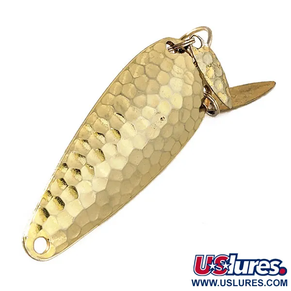 Hamrade guldytor fångar ljuset vackert på detta 6 cm (2 1/4") långa vintagefynd. Detta vasskyddade Weedless Marathon skeddrag på 12 g (2/5 oz) har produktkod 11355 och en distinkt design avsedd för fiske i tät vegetation. Två rörliga ljudblad är fästa baktill, vilket skapar reflexer och vibrationer samtidigt som de hjälper till att dölja kroken. Ett klassiskt vasskydd är integrerat för att skydda kroken, vilket gör det lämpligt för kast i nate och näckrosbälten. Baksidan visar tydligt det stämplade ursprunget från Wisconsin-baserade Marathon Bait Company, som tillverkade amerikanska sportfiskeredskap från 1929 till 1979. Detta exemplar är i 5/5-skick, där guldfinishen och detaljerna framstår som extremt välvårdade och rena. Den texturerade framsidan är utformad för att maximera ljusreflektion från olika vinklar, vilket återspeglar det gedigna hantverket från mitten av förra seklet.