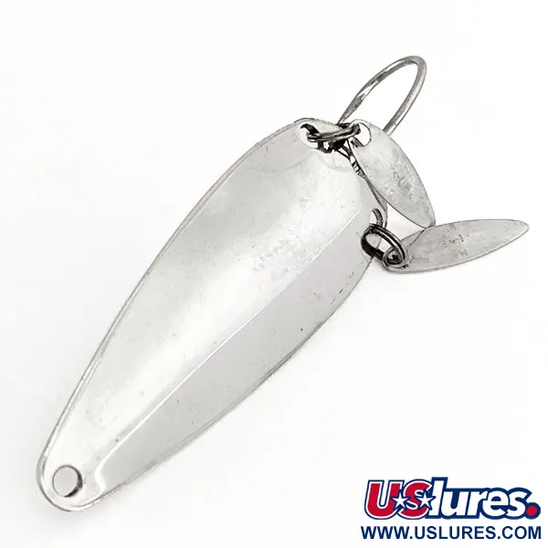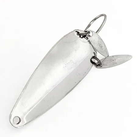 Nickelytorna på detta 12 g (2/5 oz) skeddrag ger ett högkontrast-blixtsken som är utformat för att imitera betesfisk. Nära kroken sitter två avlånga "soniska" blad, som fungerar för att lägga till visuellt intresse och hjälpa till att dölja kroken. Undersidan visar tydligt stämplarna "MARATHON" och "USA", kännetecken för den kvalitetsproduktion som kom från Wisconsin-baserade Marathon Bait Company mellan 1929 och 1979. Betet mäter 6 cm (2 1/4") i längd och dess profil är specialbyggd för kast i tät vegetation, med hjälp av det integrerade vasskyddet i tråd som skyddar enkelkroken. Dess skick är 5/5, med en klar lyster och vassa delar över hela kroppen och de sekundära bladen. Artikelkod 11343 representerar en funktionell del av fiskeredskapshistoria från mitten av århundradet med fokus på vasskyddad presentation.
