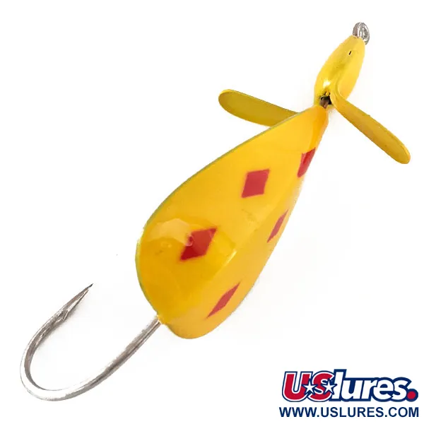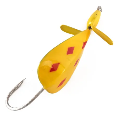 Five of Diamonds-mönstret — en klassisk gul bas med fyra distinkta röda diamanter på skeden och en på huvudet — kännetecknar denna Weedless Panther Martin Weed Wing. Betet är designat för fiske i tät vegetation och har en stor enkelkrok placerad bakom den droppformade kroppen. En gulmålad metallpropeller är monterad i nosen för att skapa störningar på ytan utan att fastna i skräp. Denna specifika modell med produktkod 11398 väger 1/2 oz (14 g) och är 2 3/4" (7 cm) lång. Undersidan av betet har en ren, omålad silverfinish i metall som kontrasterar mot den färgstarka ovansidan. Tillverkad i USA, detta exemplar är oanvänt och i utmärkt skick.