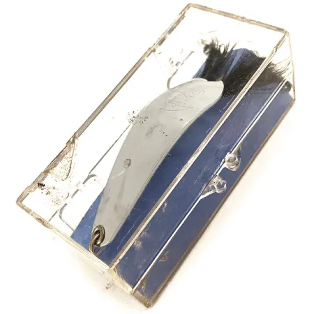 Nickelplätering definierar estetiken hos detta Weezel Rex Weedless Spoon, ett 12,5g (2/5oz) skeddrag för spinnfiske i tät vegetation. Tillverkat av Weezel Bait Co. i USA innan Eppinger tog över produktionen, representerar detta exemplar en specifik era inom sportfisketillverkning. Varumärket är stämplat direkt på metallen och är tydligt och skarpt. Med en längd på 5,5cm (2 1/4") har draget ett robust vasskydd av metalltråd för att skydda krokspetsen. Svarta fjädrar pryder bakre delen och ger en tydlig profil som kompletterar den blanka nickelfinishen. Produktkod 11646 identifierar detta oanvända objekt, som ligger kvar i sin ursprungliga genomskinliga ask med den klassiska blå baksidan. Metallen och detaljerna visar inga tecken på ålder eller slitage.