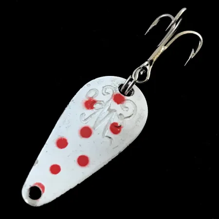 Röda prickar spridda över en vit emaljfinish definierar framsidan av detta kompakta skeddrag i metall på 3 cm. Detta amerikansktillverkade Weller-drag med produktkod 5033 väger exakt 3,7 g och passar perfekt för lätt fiske. En utsmyckad, präglad "W"-logotyp fungerar som en central punkt på den målade sidan, karaktäristisk för vintagehantverket från USA. Medan framsidan ger en hög visuell kontrast, är baksidan färdigställd i polerad nickel för ett distinkt metalliskt blänk. I ett välbevarat 5/5-skick förblir färgen tjock och färgerna är levande över hela kroppen. Skeddraget är riggat med en robust fjäderring och en klassisk trekrok, vilket bibehåller sin ursprungliga hårdvarukonfiguration.