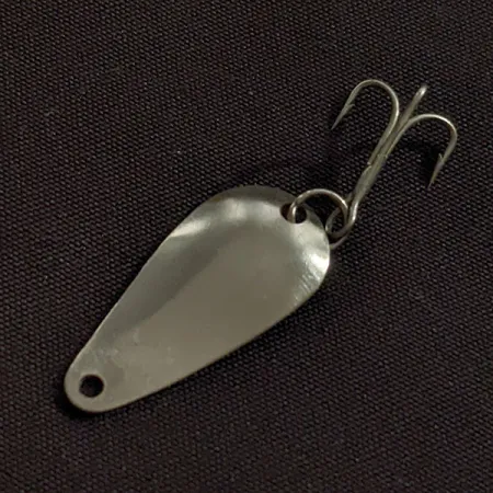 Med en vikt på lätta 1,7 g (1/16 oz) är Weller Gypsy King Deluxe ett kompakt, USA-tillverkat skeddrag som utmärker sig med sin klassiska tvåfärgade metallkonstruktion. Kroppen mäter 2,7 cm (1") och har en droppform med en blank nickelyta på den konvexa sidan och en varm kopparyta på baksidan. Detta exemplar, med produktkod 22945, är i ett utmärkt 5/5-skick och har kvar sin rena och blanka finish på båda metallsidorna. Utrustningen består av en liten fjäderring som fäster en vass trekrok i dragets breda ände, medan den smala änden är förborrad för direkt montering på linan. Detta specifika drag är ett bevis på den amerikanska sportfiskeindustrin från mitten av förra seklet, designat för finessfiske med lätta redskap där kontrasten mellan nickel- och kopparytorna skapar en distinkt visuell profil.