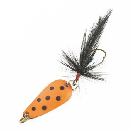 Orange emalj med tydliga svarta prickar täcker det droppformade skedbladet på Weller Gypsy King Deluxe, ett klassiskt mikroskeddrag med ursprung i USA. Med sin nätta vikt på 1,7 g (1/16 oz) är betet framtaget för lätt fiske efter abborre eller öring. Kroppen på 2,7 cm (1") kompletteras av en fyllig svart fjäderdressing bunden vid krokstammen med ett inslag av röd tråd, vilket ger betet en större profil i vattnet. Detta exemplar, med produktkod 24165, är i utmärkt skick (5/5) med välbevarade komponenter och en ren finish på både skedbladet och den fasta enkelkroken. Wellers design för Gypsy King-serien kombinerade ofta metalliska ytor med starka färger, vilket här syns tydligt i kontrasten mellan den orangea ytan och det mörka fjäderhacklet.
