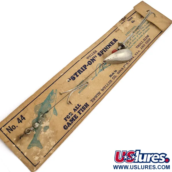 En vikt på 7 g (1/4 oz) framhäver den balanserade konstruktionen hos detta Iowa-tillverkade bete, utformat speciellt för fiske på djupt vatten. Med en total längd på 20 cm (7 3/4") ger nickelbladet på Weller Strip-On Spinner №44 (artikelnummer: 22405) ett kraftigt blänk vid långsam trolling, helt enligt Erwin Weller Co:s originalinstruktioner. Det unika monteringssystemet har en vajer som förs genom en betesfisk och säkras med en dubbelkrok som håller betet rakt. En enstaka röd pärla sitter intill spinnarbygeln och ger en subtil kontrast mot metallen. Detta exemplar är oanvänt och sitter fortfarande kvar på sitt ursprungliga butikskort, komplett med det historiska priset på 45 cent och detaljerade anvisningar för 'Strip-On'-tekniken. Konstruktionen börjar med ett robust blylekare som övergår i en rak trådaxel där spinnarkomponenterna och fästpunkterna för kroken sitter.