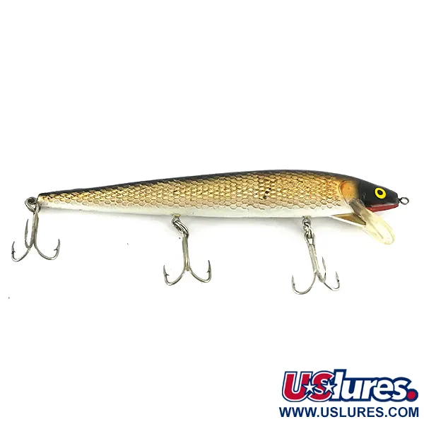 Guldfärgade fjällmönster pryder den 14 cm (5 1/2") långa kroppen på denna vintage Whopper Stopper Hellcat, som är listad under produktkod 7744. Med en vikt på 10 g (1/3 oz) har wobblern ett mörkt huvud som övergår rent i den reflekterande guldkroppen, förstärkt av gula ögon med röd kant. Tillverkad i USA, använder denna modell en konfiguration med tre krokar som är typisk för längre minnow-beten avsedda för kast eller trolling. Den klara hakskeden är monterad direkt i betets nos under linfästet. Detta exemplar är i 5/5 skick, med finish och hårdvara i mycket välbevarat tillstånd.