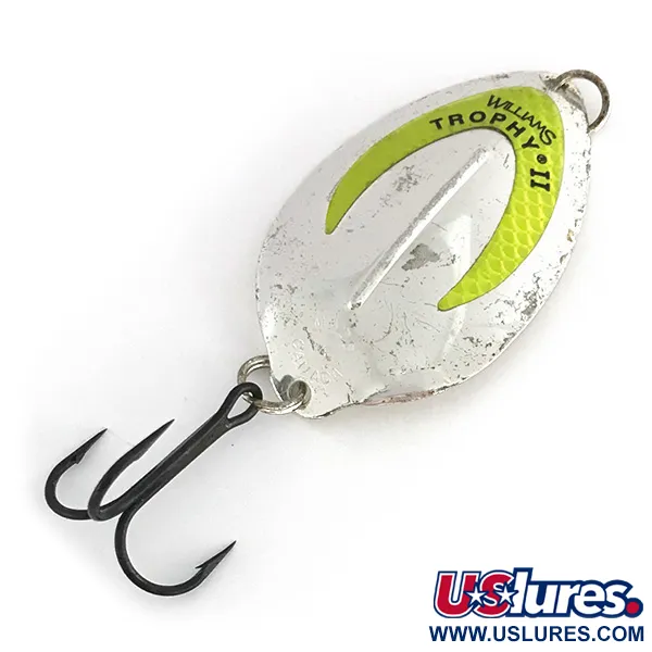 Äkta försilvring ger en unik reflekterande kvalitet till detta 21g (3/4oz) skeddrag, en finish som den kanadensiska tillverkaren valde för dess överlägsna blänk i djupt eller grumligt vatten. Williams Trophy (Produktkod 8277) mäter 6,5cm (2 1/2") och har en u-formad chartreuse-accent som fungerar som en tydlig huggpunkt. Vid svaga ljusförhållanden reagerar detta målade inlägg med ett distinkt sken, vilket kompletterar den försilvrade kroppens naturliga lyster. Ytan visar lätta tecken på användning och håller ett skick på 4/5, vilket speglar dess historia samtidigt som det förblir fullt funktionellt. En kraftig fjäderring säkrar en svart trekrok, designad för påfrestningarna vid kast eller trolling efter större rovfiskar som kanadaröding och gädda. Detta exemplar representerar de klassiska designstandarder som utvecklades av bröderna Williams, som banade väg för användningen av ädelmetallplätering i sportfisketillverkning under tidigt 1900-tal.