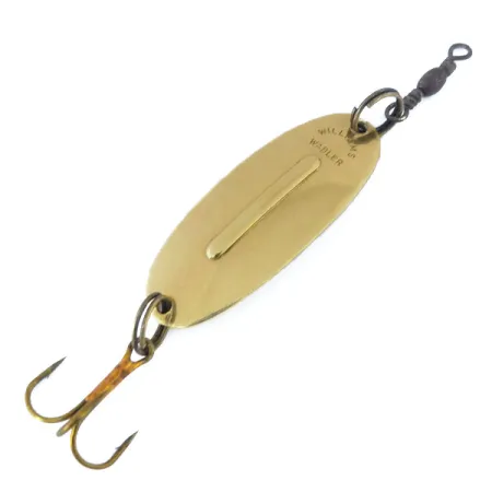 Stämplad med märkningen "MADE IN CANADA", visar mässingskroppen på detta 4 cm (1 1/2") skeddrag den precision som har hållit denna modell i fiskelådorna sedan början av 1900-talet. Just detta exemplar har produktkod 10999 och väger mångsidiga 7 g (1/4oz). Den distinkta upphöjda längsgående åsen längs mitten av det guldfärgade bladet är ett funktionellt kännetecken, konstruerat för att bibehålla stabilitet vid både spinnfiske och trolling efter gädda och gös. Produktionen flyttades helt till Kanada 1978, vilket stämmer överens med den tydliga texten på den konkava sidan. Skicket är 5/5, vilket gör den till ett mycket välskött exempel på kanadensisk fiskehistoria. En lekare är fäst vid den övre fjäderringen, medan en bronserad trekrok fullbordar utrustningen i den bakre änden.