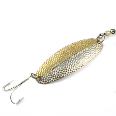 Den hamrade texturen över bladet ger en tydlig visuell profil som samlare av Williams-skeddrag omedelbart känner igen. Detta Williams Wabler med produktkod 1202 har en klassisk Silver / Gold-finish. Försilvringen är ett signum för varumärkets engagemang för hög synlighet i vattnet. Med en vikt på 18g (2/3oz) och en längd på 8cm (3 1/4") är draget byggt för stora mål som gädda och gös. En karakteristisk upphöjd ryggås sträcker sig längs mitten av skeden, en strukturell detalj som hjälper till att bibehålla gången vid olika invevningshastigheter. Detta USA-tillverkade exemplar levereras med sin originalkrok och ett integrerat lekande. Skicket är ett stabilt 4/5, där pläteringen har kvar ett ljust och rent utseende.