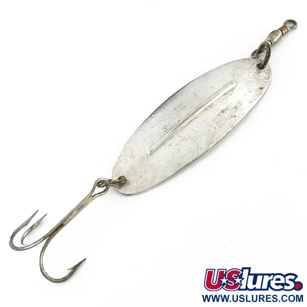 Äkta silverplätering kännetecknar finishen på denna 8,2 cm (3 1/4") kanadensiska klassiker, ett kännetecken för tillverkningsprocessen som säkerställer hög synlighet under olika vattenförhållanden. Under produktkod 8446 har skeddraget den karaktäristiska upphöjda längsgående åsen som ger strukturell stabilitet till metallkroppen vid jämn hemtagning. Med en vikt på 18 g (2/3 oz) erbjuder den rejäl massa för långdistanskast eller kontrollerad trolling efter större gädda och gös. Komponenterna är pålitliga och består av en robust trekrok säkrad med en fjäderring i stjärten, medan nosen är utrustad med ett funktionellt lekande för att hantera linsvinning. Detta exemplar är i skick 4/5 och uppvisar välbevarade silverytor med endast mindre spår av tidigare användning. Stämplad med tillverkarens märke på undersidan behåller metallen sina distinkta reflekterande egenskaper utan den hårdhet som vanlig kromplätering ger.