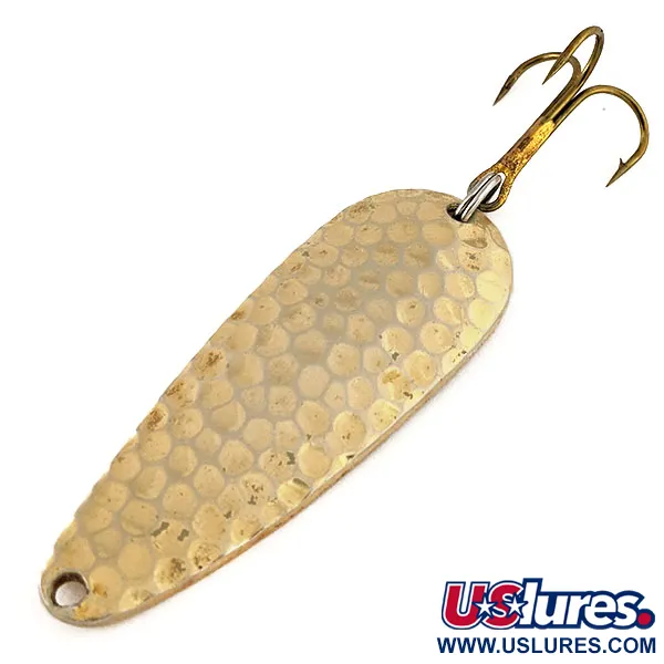Hamrat guld är huvudfinishen på detta vintage skeddrag, vilket ger den en klassisk textur som samlare omedelbart känner igen. Med en vikt på 16g (3/5oz) har det tillräckligt med massa för effektiva kast under olika vattenförhållanden. Baksidan är slät och har namnet "WONDERLURE" stämplat i metallen, ett signum för hantverk från amerikanska Acme. Med produktkod 11310 är detta 5,7cm (2 1/4") långa drag i toppskick, klassat 5/5 för sitt rena, ljusa utseende och brist på synligt slitage. En robust fjäderring förbinder originaltrekroken med den bredare änden av kroppen, medan den motsatta smala änden ger en ren fästpunkt för linan.