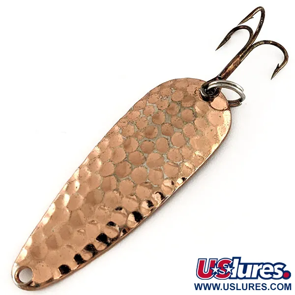 Den hamrade ytan på detta 2 1/4" (6 cm) skeddrag är utformad för att fånga och sprida ljuset i flera riktningar. Acme Wonderlure (artikelnummer 12252) är ett klassiskt USA-tillverkat kastdrag. Den droppformade kroppen är gjord av koppar med en tydlig «WONDERLURE»-prägling på den släta baksidan. Med en vikt på 2/5 oz (11 g) är dragets massa koncentrerad för att nå längre vid kast från land eller båt. I den smala änden håller en robust fjäderring en bronserad trekrok, medan den bredare änden har ett fästhål för linan. Skicket är 5/5, med tydlig definition av det hamrade mönstret och välbevarad metall. Acmes långa tillverkningshistoria i USA syns i stämpelns kvalitet och kopparplåtens tjocklek.
