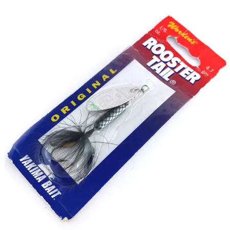 Förnicklade pilblads-skedar parade med ett tätt svart fjäderhackle utmärker detta specifika Yakima Bait-bete. Med en vikt på 4,7 g (3/16 oz) och en längd på 7 cm (2 3/4") representerar denna modell 9836 en hörnsten i Worden’s Original Rooster Tail-arvet. Designen, som utvecklades av Howard Worden i Wisconsin, har visat sig vara extremt effektiv i hårt fiskade öringvatten tack vare kombinationen av dess slanka profil och stjärtfibrernas naturliga rörelse. Detta exemplar levereras i sin originalförpackning och är oanvänt. Om man tittar noga på silverskeden ser man den ikoniska varumärkesstämpeln tydligt, vilket stämmer överens med den klassiska inline-spinnarkonstruktionen som har varit en stapelvara i amerikanska fiskelådor sedan 1950-talet. Baksidan av det vita kortet ger standard Yakima Bait-identifikation och ursprung, vilket bekräftar dess status som ett välbevarat samlarobjekt.