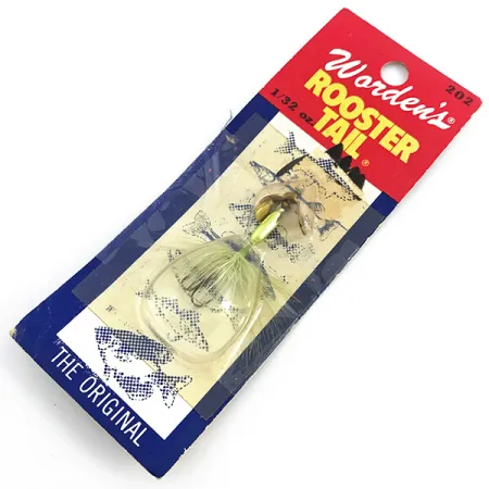 Med en vikt på endast 1/32 oz (0,9 g) är detta ultralätta exemplar ett typexempel på den finess-strategi som Yakima Bait har förfinat med Worden’s Rooster Tail-serien. Betet är monterat på en 1 3/4" (4,5 cm) ram och har en polerad guldpilbladssked parad med en handknuten chartreusefärgad hackelstjärt, en kombination som har produktkod 6748. Denna specifika storlek utvecklades ursprungligen för flugspöfiske eller ultralätta spinnutrustningar, designad för ett mjukt nedslag i vattnet vid fiske efter skygg öring eller abborrfiskar. Konstruktionen bygger på en in-line spinnardesign där skeden roterar runt en central axel, kompletterad av de pulserande naturfibrerna i stjärten. Artikeln är oanvänd och ligger kvar i sin ursprungliga vintage-bubbelförpackning, som har skyddat guldfinishen och hacklet från åldring. Kartongbaksidan bär den ikoniska röd-vit-blå logotypen med 202-seriens märkning synlig på kortets huvud.
