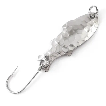 Hamrade nickelytor som den på detta 1/16 oz (2,2 g) Yakima Bait-exemplar designades för att skapa komplexa ljusreflexer under olika vattenförhållanden. Denna Worden's Tripple Teaser, katalogiserad under produktkod 4838, är ett klassiskt amerikansktillverkat skeddrag som mäter exakt 1 1/2" (4 cm). Den konvexa sidan har djupa, cirkulära gropar, medan den konkava insidan är slät och bär en tydlig "Worden's Triple Teaser"-stämpel. Det är riggat med en enkelkrok fäst med en fjäderring, en konfiguration som ofta föredras för att underlätta återutsättning vid fiske efter öring eller abborrfiskar. Hårdvaran, inklusive fjäderringen för linan, är i toppskick. Med betyget 5/5 uppvisar metallen en ljus och ren lyster på båda sidor. Detta USA-tillverkade bete är ett utmärkt exempel på den enkla och effektiva utrustning som Yakima Bait producerade.
