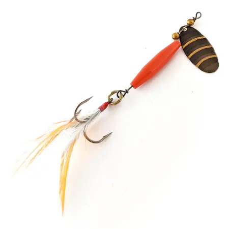 Guldstrimmor kontrasterar tydligt mot den svarta finishen på den droppformade skeden på denna Worth #301 spinnare. Med en längd på 9 cm har draget en avlång, lysande orangeröd kropp som ger en tydlig visuell kontrast. Vikten är 9 g och den är byggd på en robust trådstomme, typisk för Worths amerikansktillverkade komponenter från mitten av 1900-talet. Trekroken är fjäderbeklädd med naturligt vita och beige fjädrar, säkrade med en tydlig röd trådlindning nära öglan. Komponenterna, som mässingspärlorna och byglen, uppvisar den kvalitetskonstruktion som samlare förväntar sig av Worth Company under produktkod 18665. Skicket är 5/5, med en ren finish på de målade delarna och välbevarade fjäderfibrer. En liten mässingsring kopplar samman huvudkroppen med den fjäderbeklädda kroken, vilket möjliggör enkelt byte eller anpassning samtidigt som dragets övergripande balans bibehålls vid utkast.
