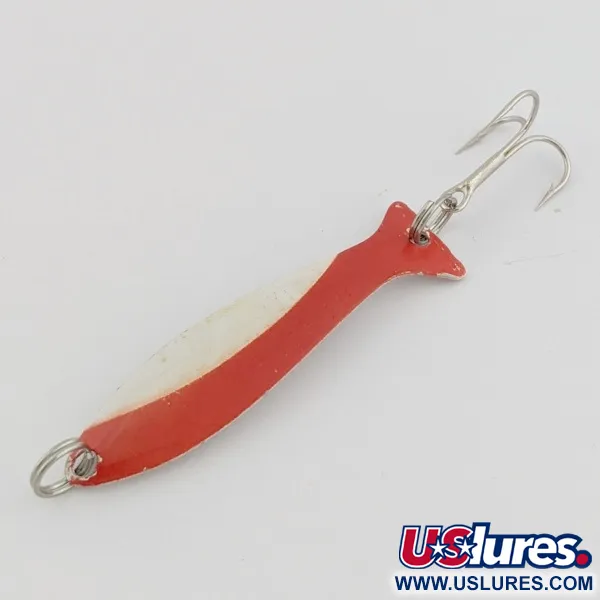 Röd och vit färg på en förnicklad bas ger denna Worth Fly Rod Demon en klassisk profil med hög synlighet. Den stansade metallkroppen, som mäter 4 cm (1 1/2") och väger 1,5 g (3/64 oz), har en bred yta speciellt utformad för trolling. Draget behåller sin gång vid låga hastigheter, vilket gör det lämpligt för gäddfiske i grund vegetation eller för att nå kanadaröding i djupa termokliner med monofilament, lead core eller downriggers. Färgen och förnicklingen är i skick 4/5 och har kvar den ursprungliga lyster man förväntar sig av ett vintage Worth-drag. Denna modell är identifierad med kod 24497.