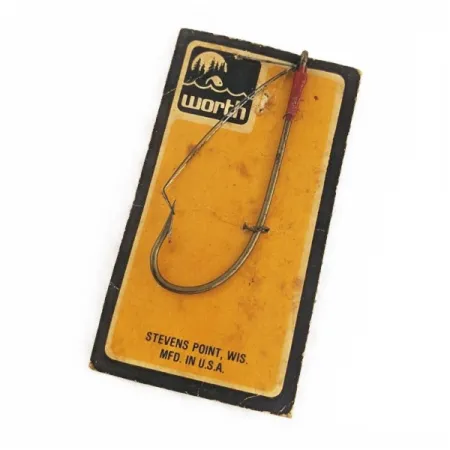 Förnicklingen ger en ren och blank yta på denna vasskyddade krok, designad för fiske i tät vegetation. Ett enkelt trådskydd är snyggt fäst vid öglan med handlindad röd tråd, vilket ser till att spetsen inte fastnar. Worth tillverkade denna artikel, med produktkod 24486, vid sin anläggning i Stevens Point, Wisconsin. Kroken sitter fortfarande kvar på det gamla svartgula förpackningskortet och är i oanvänt skick med betyget 6. Grafiken på förpackningen visar den gamla logotypen med stiliserade berg- och vattenelement som är typiska för tillverkarens tidiga profilering.