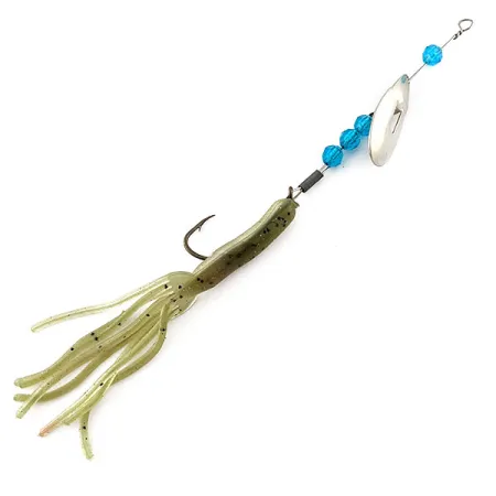 Komponenter i nickel och blått definierar det visuella uttrycket hos modell 20140, vilket representerar en klassisk amerikansk sportfiskedesign från Worth. Med en längd på 11 cm (4 1/4") och en vikt på 6 g (3/16 oz), har betet en utmärkande June Bug-konstruktion där skeden är monterad på en trådarm. Denna specifika konstruktion uppskattas av sportfiskare för sin pålitliga start, vilket säkerställer att den nickelpläterade skeden roterar jämnt utan att kärva. Riggen pryds av tre fasetterade blå pärlor under skeden och en matchande pärla nära linfästet, vilket skapar en visuell kontrast mot den metalliska glansen. En jiggkropp i genomskinlig olivgrön färg med svarta flingor ger en subtil, texturerad profil bakom hårdvaran. Enkelkroken är snyggt integrerad i mjukbetet, och hela ekipaget är i skick 5/5 med rena ytor och välbevarade material genomgående. Designen från Worth är specifikt framtagen för tekniker som kräver stadigt blänk och konsekvent rotation.