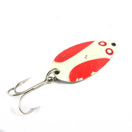 Detta skeddrag mäter 1 1/2" (3,5 cm) och har en målad framsida med ett karakteristiskt rött och vitt mönster, accentuerat av fjälliknande detaljer och röda cirkulära ögon nära huvudet. Wright & McGill Pay-Master, med produktkod 0941, är en klassiker i amerikanska fiskelådor från mitten av seklet. På baksidan finns en polerad nickelfinish där varumärket och vikten på 1/4 oz (7 g) är djupt stämplade i metallen. I sitt 4/5-skick är färgen fortfarande livfull och hårdvaran, inklusive trekroken och fjäderringen, är välbevarad. Drags konstruktion utgår från en droppformad metallkropp som ger den vikt som krävs för kast mot huggzonen. Varje detalj, från den tydliga stämpeln på baksidan till den specifika målningen, speglar de tillverkningsstandarder som förr var vanliga i USA. Fästpunkten vid huvudet är rent borrad och avsedd för standardfjäderringar eller beteslås.