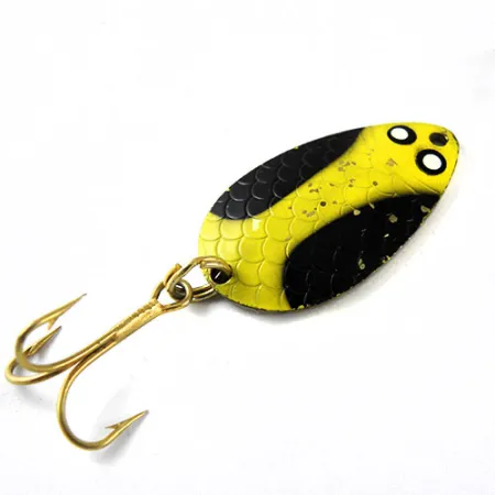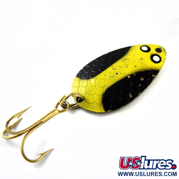 Tydligt instämplat på mässingsbaksidan bekräftar markeringen 'WRIGHT & McGILL 'PAY-MASTER' 1/4 OZ' det amerikanska arvet hos detta skeddrag. Draget är 1 1/2" (3,5 cm) långt och har ett iögonfallande gult och svart fjällmönster som påminner om ett honungsbi, kompletterat med två tydliga vita ögon vid huvudet. Den tunga mässingskonstruktionen ger den vikt på 1/4 oz (7 g) som krävs för långdistanskast. Denna specifika modell, listad under produktkod 1054, är i ett gediget 4/5-skick med en välbevarad lyster i finishen tillsammans med sin ursprungliga guldpläterade trekrok. Historiskt sett använde Wright & McGill denna strukturerade fjällyta för att hjälpa till att fånga ljuset under den målade ytan. Komponenterna, inklusive fjäderring och krok, är rena och ordentligt fastsatta.