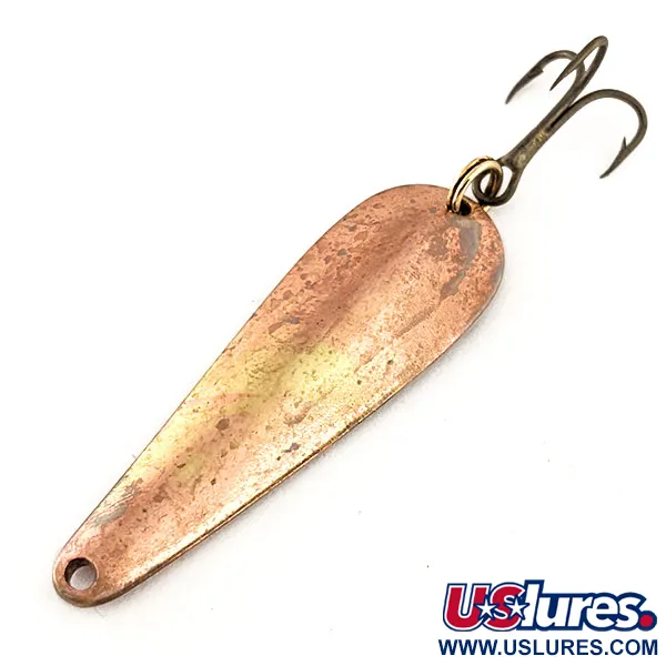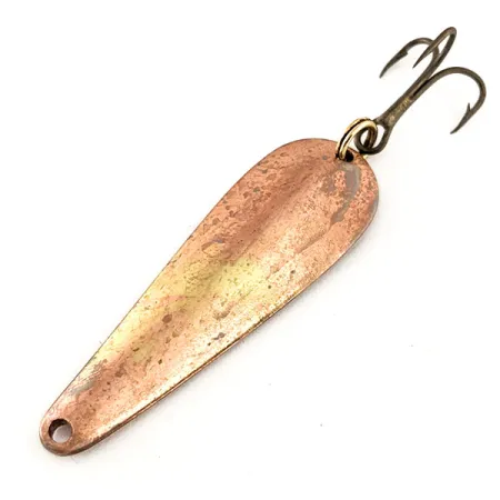 Brons- och mässingstoner definierar finishen på detta vintageexemplar, som väger in på mångsidiga 1/4 oz (7 g). Tydligt stämplade i metallytan finns Wright & McGills tillverkarmärken och modellbeteckningen "STREAMLINER", ett kännetecken för amerikanskt hantverk från mitten av århundradet. Med en total längd på 1 3/4" (4,5 cm) övergår skedens droppformade profil från ett smalt huvud till en bredare, rundad stjärt där maskinvaran är monterad. En enkel trekrok är fäst med en robust fjäderring baktill. Detta USA-tillverkade bete, med produktkod 11544, håller en stabil kondition på 4/5 och uppvisar smärre ytkaraktär medan metallens strukturella integritet förblir intakt. Linögat är rent stansat i den avsmalnande änden, utformat för direkt knytning eller användning med ett litet beteslås.