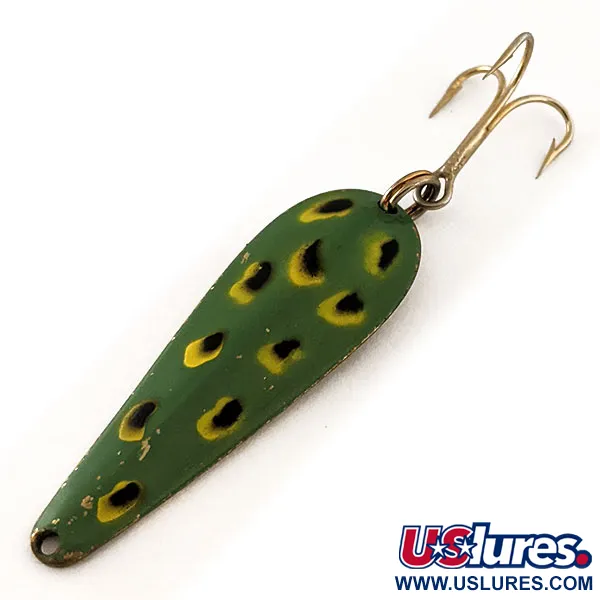 Mässing utgör basen i detta 4,5 cm långa droppformade skeddrag. Direkt instämplat på baksidan finns Wright & McGill- och Streamliner-märkningarna som är skarpa och lättlästa, vilket identifierar detta specifika exemplar med produktkod 11704. Framsidan har ett traditionellt Frog-mönster med en mörkt olivgrön bas och gulramade svarta prickar som efterliknar ett naturligt byte. Med en vikt på 7 g är draget utrustat med en guldfärgad trekrok monterad med en fjäderring i den bredare änden. Detta USA-tillverkade fiskeredskap har skicket 5/5; emaljfärgen har kvar sin ursprungliga lyster och baksidan i mässing är ren och blank. Metallens avsmalnande form fram mot linöglan tyder på en design skapad för kastfiske eller trolling under varierande förhållanden i sötvatten.