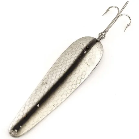 Stämplad med 'Wright & McGill' och 'Streamliner - 5/8 OZ' på baksidan, kommer detta klassiska skeddrag från den välkända tillverkaren i Denver. Ovansidan har ett texturerat grått fjällmönster, en fin hexagonal bikakedesign på en blank nickelbas med en mörk rygg. Med produktkod 13030 mäter draget 3" (7,5 cm) och väger 2/3 oz (18 g). Skicket är utmärkt (4/5), med en välbevarad finish och tydlig stämpling. En stor trekrok är monterad baktill via en robust fjäderring. Designad för kast eller trolling, är den tunga metallkroppen gjord för att hålla profilen vid invevning. Ett precisionsborrat hål i den avsmalnande nosen fungerar som fästpunkt för linan.