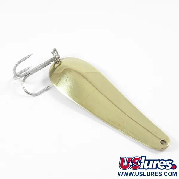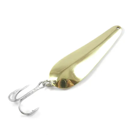Detta 6 cm (2 1/4") långa skeddrag i metall glänser med sin polerade guldplätering och är en klassiker i amerikanska draglådor från mitten av seklet. Wright & McGill Streamliner, med produktkod 3056, balanserar en vikt på 11 g (2/5 oz) över sin långsmala, droppformade kropp. På insidans kurva återfinns tillverkarens märke och modellnamnet djupt stämplat i metallen, ett kännetecken för Wright & McGills noggrannhet under produktionsåren i USA. Detta exemplar är i skick 5/5 och bibehåller en slät, spegelblank yta över hela kroppen. Monteringen inkluderar en robust trekrok säkrad med en fjäderring, redo för fiske eller som samlarobjekt. Tyngden i skeddraget ger utmärkta kastegenskaper, medan det lilla linhålet i den avsmalnande änden är rent och perfekt centrerat.