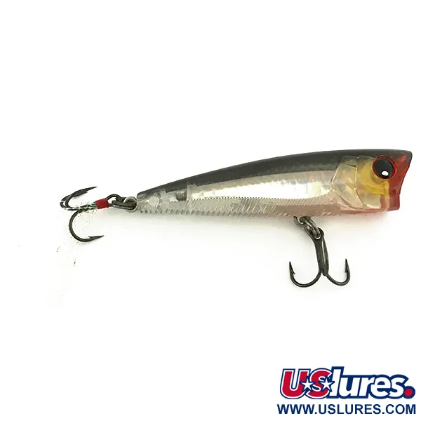 Detta japansktillverkade ytbete på 7,5 cm (3") har en distinkt skålad röd mun designad för presentationer direkt på ytan (0 m). Yo-Zuri 3DB Popper väger 10 g (1/3 oz) och har produktkod 6967. Den är utrustad med märkets interna 3D-prismafinish som reflekterar ljus genom den genomskinliga kroppen. En mörk kolgrå rygg kontrasterar mot de klara sidorna, medan livfulla gula accenter framhäver de stora, realistiska ögonen. Detta exemplar, tillverkat i Japan, är i utmärkt 5/5-skick och har kvar sina vassa trekrokar i svart nickel. Den bakre kroken har en subtil röd och grön fjäderdressing, en detalj som ofta föredras vid fiske efter abborre, gädda eller asp. Inre räfflor som syns genom den klara plastkroppen ger en strukturell komplexitet som är karaktäristisk för Duel/Yo-Zuri-serien.